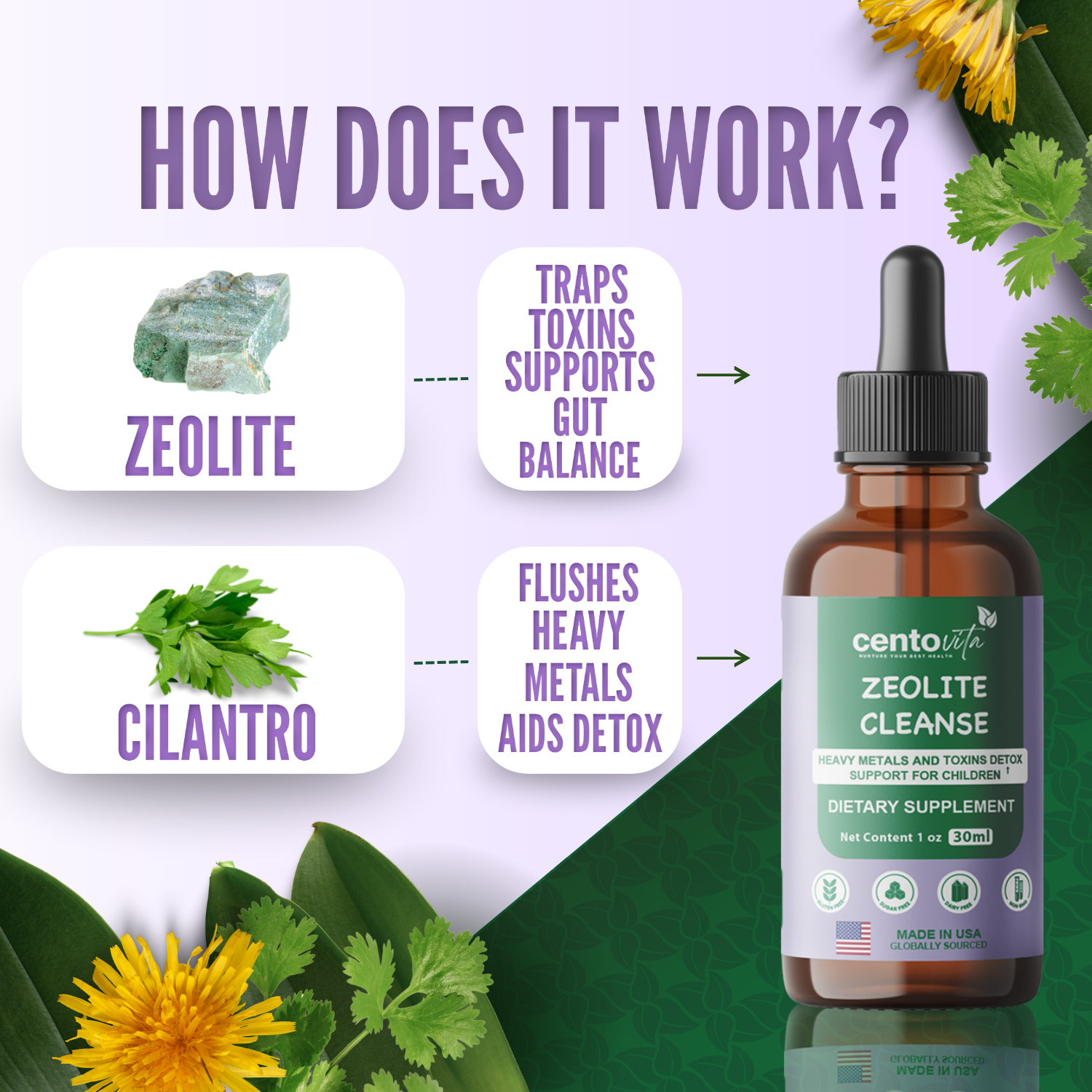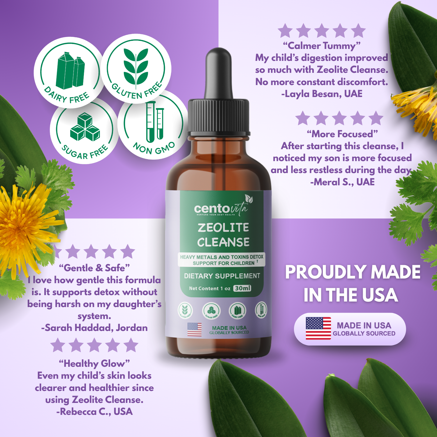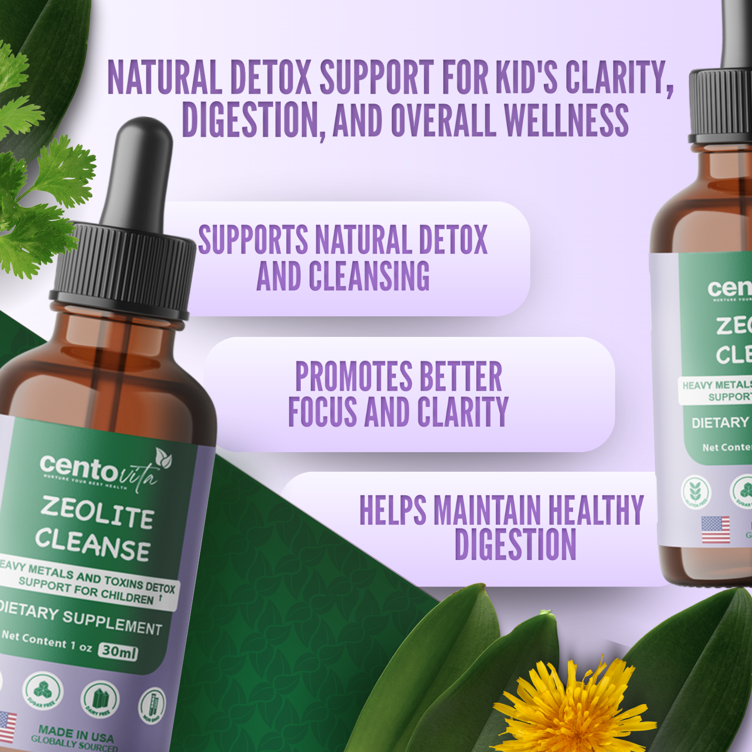 Zeolite Cleanse Drops by CentoVita International are a kid-friendly liquid supplement designed to support overall wellness in children aged 1 and up. This gentle, plant-based formula includes nutrient-rich botanicals like chlorella, cilantro, zeolite, milk thistle, dandelion root, and vitamin C—carefully selected to help support immune function, brain clarity, and daily balance.